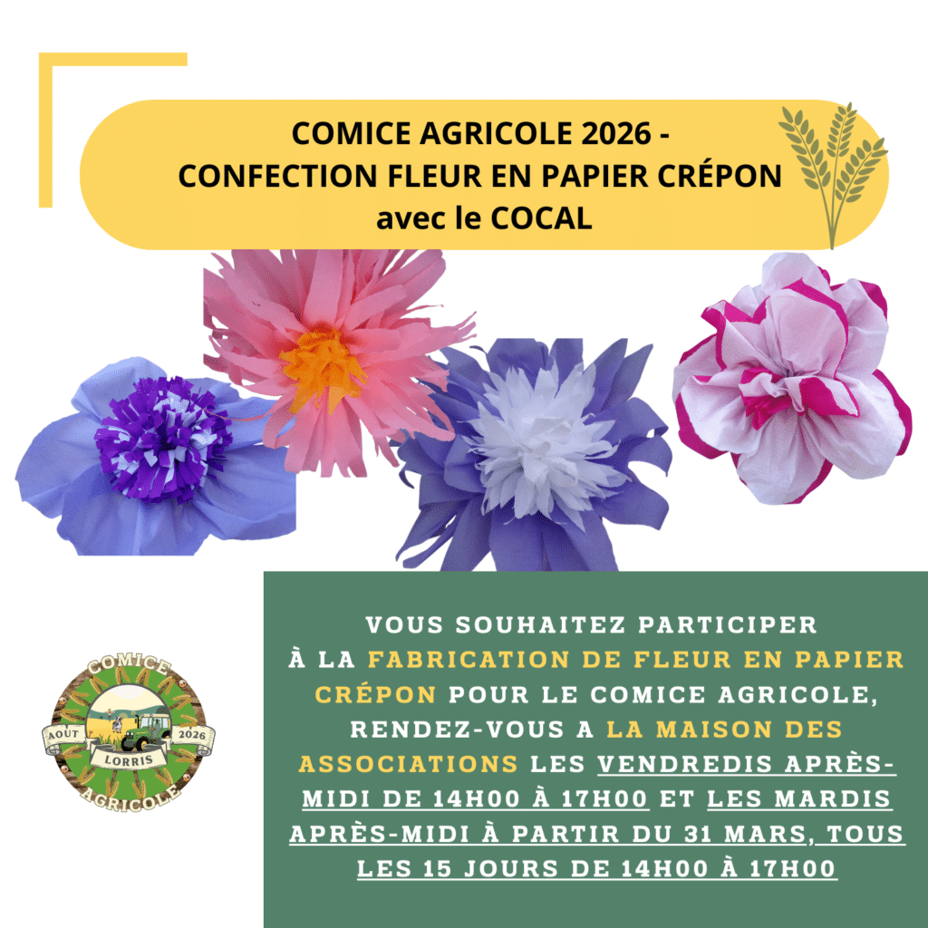 Les ateliers fabrication de fleurs en papier crépon auront lieux tous les vendredis après-midi de 14h00 à 17h00 maison des associations, à...