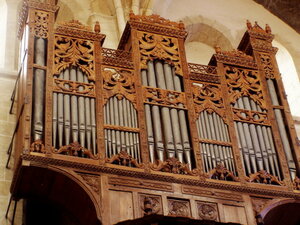 L'ensemble buffet-tribune et une partie de la tuyauterie date de 1501 tandis que la partie mécanique de l'orgue date partiellement du XVIIe siècle. Selon les historiens, la première construction de l'orgue remonte à 1501, sous le règne de Louis XII. Les seuls documents encore existants sont le buffet et sa tribune. L'instrument lui-même a été reconstruit mais le buffet garde heureusement des traces évidentes de l'instrument d'origine qui était construit selon l'esthétique italienne. L'orgue porte la marque royale. Dans la fine pointe de la corbeille de sa tribune, deux chérubins présentent un blason sur lequel on peut encore discerner les...